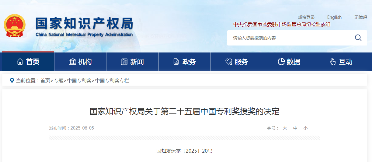 6月5日,國家知識產權局發布關于第二十五屆中國專利獎授獎的決定: